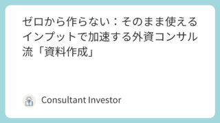 外資コンサルの資料作成は「ゼロからつくらない」が鉄則。社内資産を優先活用し、骨格を固めてギャップだけを深掘りすることで、効率と品質を同時に実現する方法を解説します。今すぐチェック!